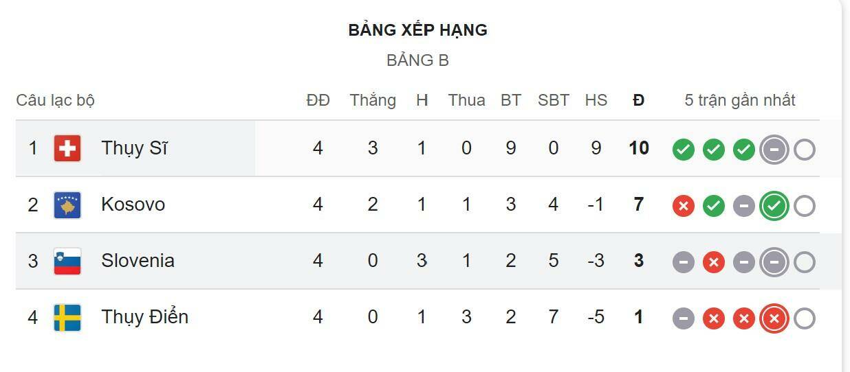 Bảng B – Thụy Sĩ chững lại, Kosovo và Slovenia trỗi dậy