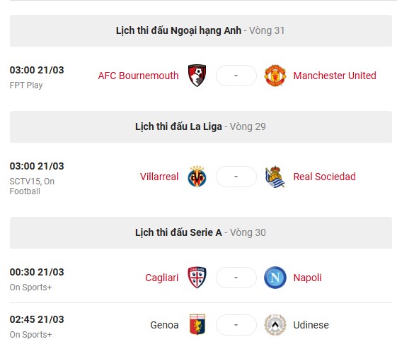 Đêm nay và rạng sáng mai, loạt trận hấp dẫn trải dài từ Ngoại hạng Anh đến La Liga và Serie A hứa hẹn mang đến những cuộc đối đầu mang tính bản lề của mùa giải. Mỗi điểm số lúc này đều có thể làm thay đổi cục diện cuộc đua top 4, suất dự cúp châu Âu, thậm chí cả cuộc chiến trụ hạng. Ngoài ra, đây còn là phép thử rõ ràng về bản lĩnh, chiều sâu lực lượng cũng như khả năng định đoạt trận đấu ở những thời khắc quan trọng nhất.