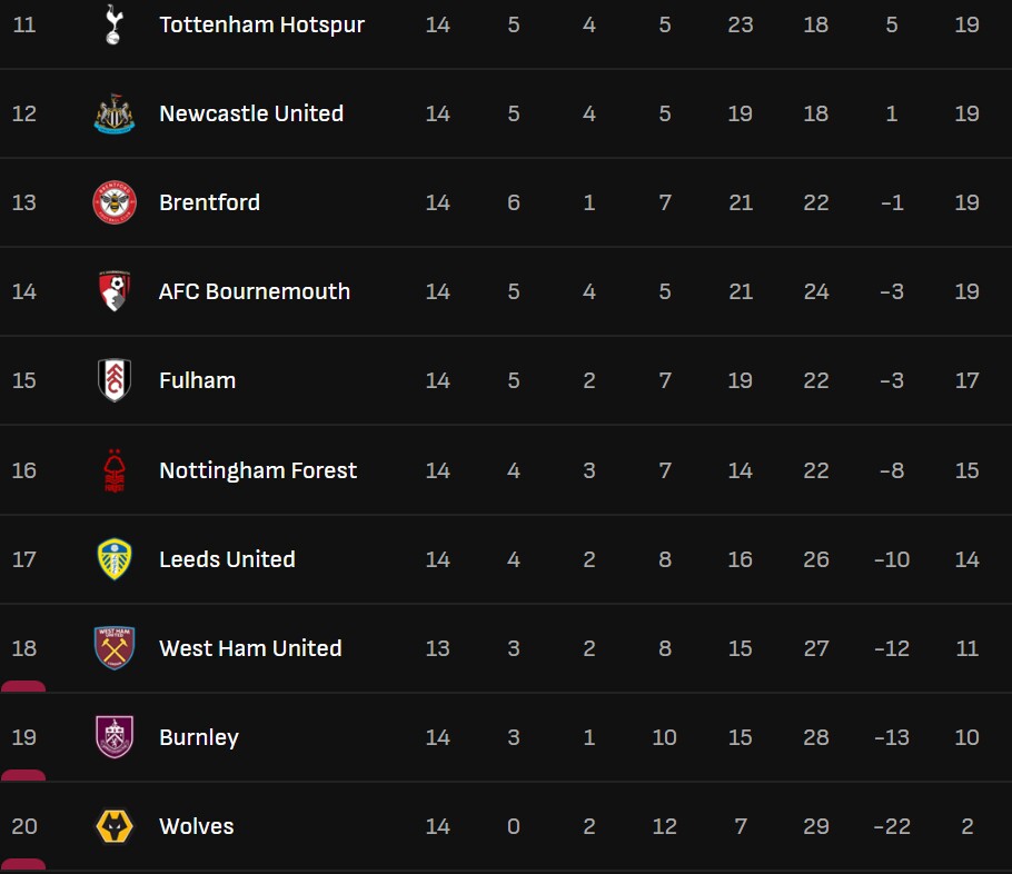 Nếu Wolves với 2 điểm và Burnley với 10 điểm vẫn chìm trong khủng hoảng, thì Leeds lại trở thành điểm sáng bất ngờ của vòng đấu. Chiến thắng 3-1 trước Chelsea không chỉ giúp họ vươn lên 14 điểm, thoát khỏi nhóm nguy hiểm, mà còn gửi thông điệp mạnh mẽ rằng họ sẽ không dễ bị đẩy xuống. Nottingham Forest với chiến thắng trước Wolves cũng vươn lên 15 điểm, tạo áp lực trực tiếp lên nhóm giữa. West Ham với 11 điểm giờ đây đứng trước nguy cơ chìm sâu nếu không có điểm khi làm khách tại Old Trafford.