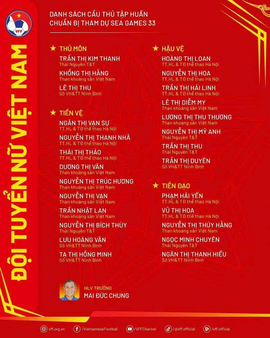 Đội tuyển nữ Việt Nam sẽ chính thức hội quân từ ngày 21-10 tại Trung tâm Đào tạo Bóng đá trẻ Việt Nam ở Hà Nội. Đợt tập trung này nhằm chuẩn bị cho SEA Games 33 diễn ra tại Thái Lan vào tháng 12 tới. HLV Mai Đức Chung đã gửi danh sách 27 cầu thủ lên Cục Thể dục Thể thao để chuẩn bị cho giải đấu quan trọng này.