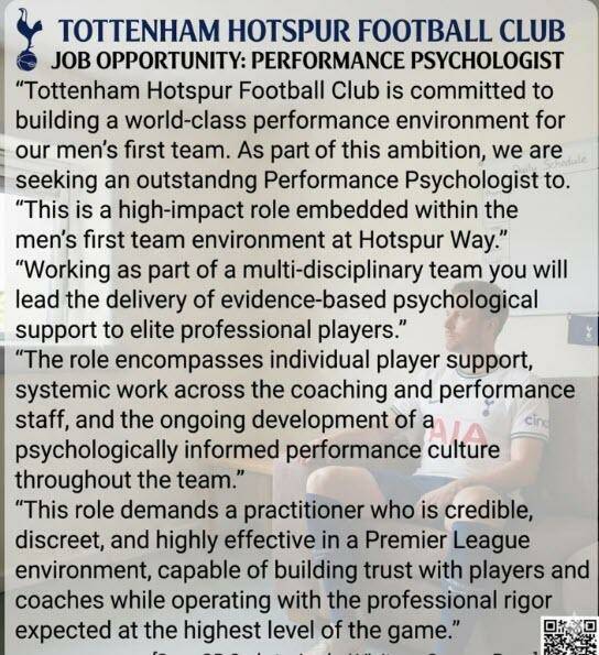 Trong bối cảnh đó, Tottenham đăng tin tuyển dụng trên mạng LinkedIn, nhấn mạnh yêu cầu về một chuyên gia “đáng tin cậy, kín đáo và hiệu quả cao trong môi trường Ngoại hạng Anh”. Câu lạc bộ cần người “có khả năng xây dựng niềm tin với các cầu thủ và huấn luyện viên, đồng thời làm việc với sự nghiêm ngặt chuyên môn được mong đợi ở cấp độ cao nhất của bóng đá”. Đây là nỗ lực nhằm giải quyết vấn đề tâm lý đang đè nặng lên phòng thay đồ.