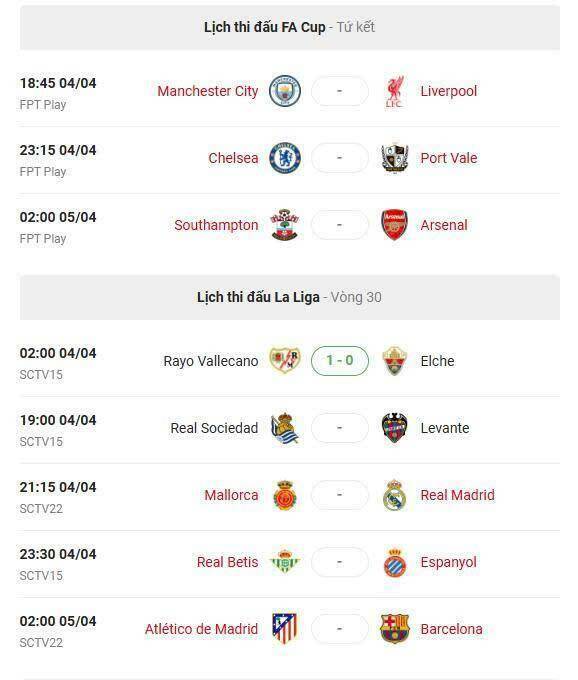 Loạt trận diễn ra trong tối nay và rạng sáng mai từ tứ kết FA Cup cho đến các màn đọ sức rực lửa ở La Liga hứa hẹn sẽ mang đến bầu không khí sôi động trên khắp các sân cỏ châu Âu, với sự góp mặt của nhiều ông lớn cùng những cặp đấu đáng chú ý. Từ những màn đối đầu đỉnh cao giàu tính chiến thuật đến các trận đấu có sự chênh lệch rõ rệt về lực lượng, tất cả đều chứa đựng những kịch bản khó lường. Đây không chỉ là cuộc cạnh tranh về đẳng cấp, mà còn là bài kiểm tra bản lĩnh, khả năng tận dụng cơ hội và sự sắc bén trong từng khoảnh khắc quyết định.
