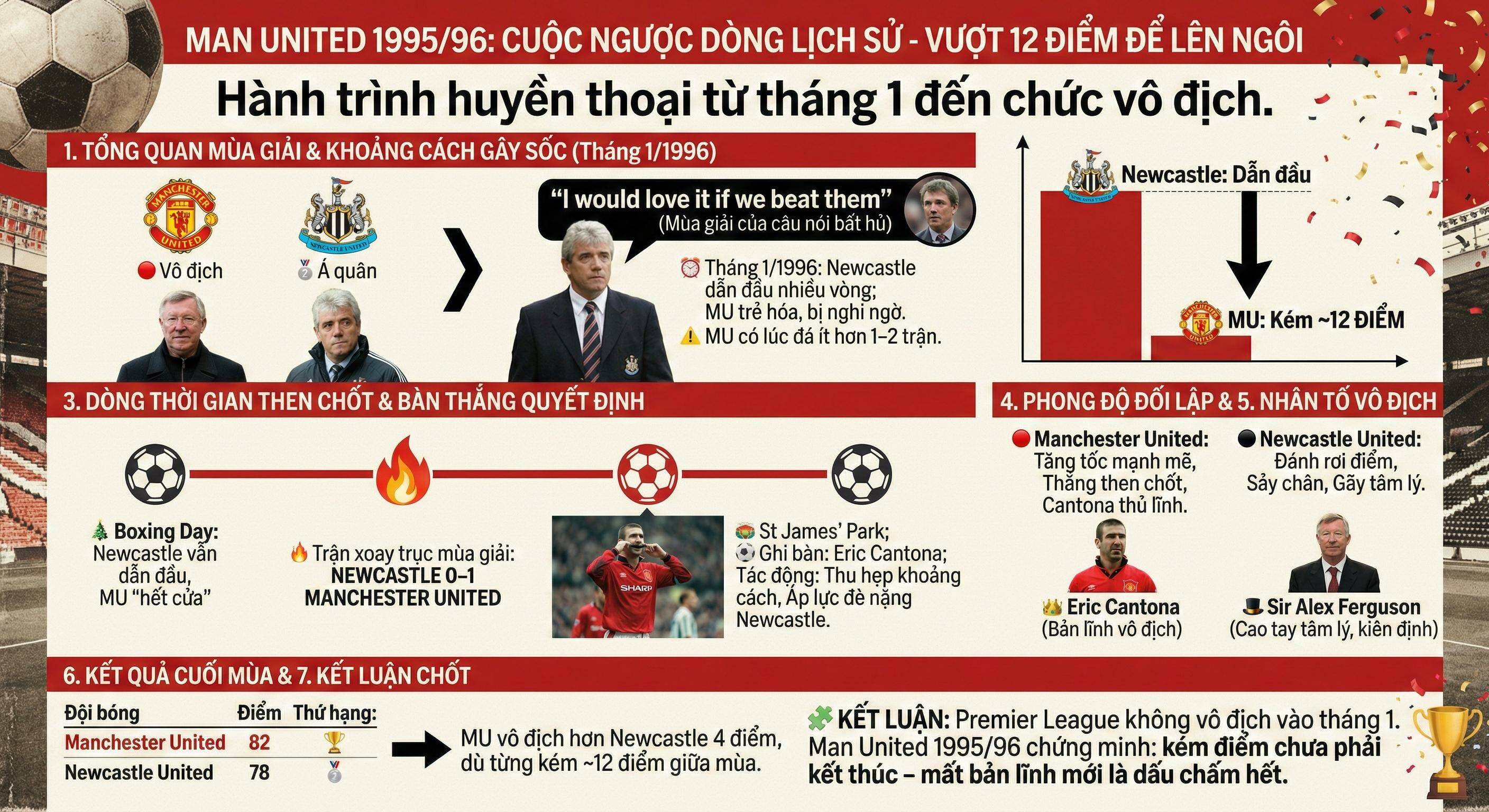 Tháng 1/1996, khi Premier League bước vào giai đoạn bản lề, MU bị Newcastle United bỏ xa tới khoảng 12 điểm. Trên bảng xếp hạng, khoảng cách đủ lớn để nhiều người tin rằng cuộc đua đã an bài. Newcastle dẫn đầu suốt thời gian dài, đá hứng khởi, còn MU thì trẻ hóa đội hình và liên tục bị nghi ngờ về bản lĩnh.