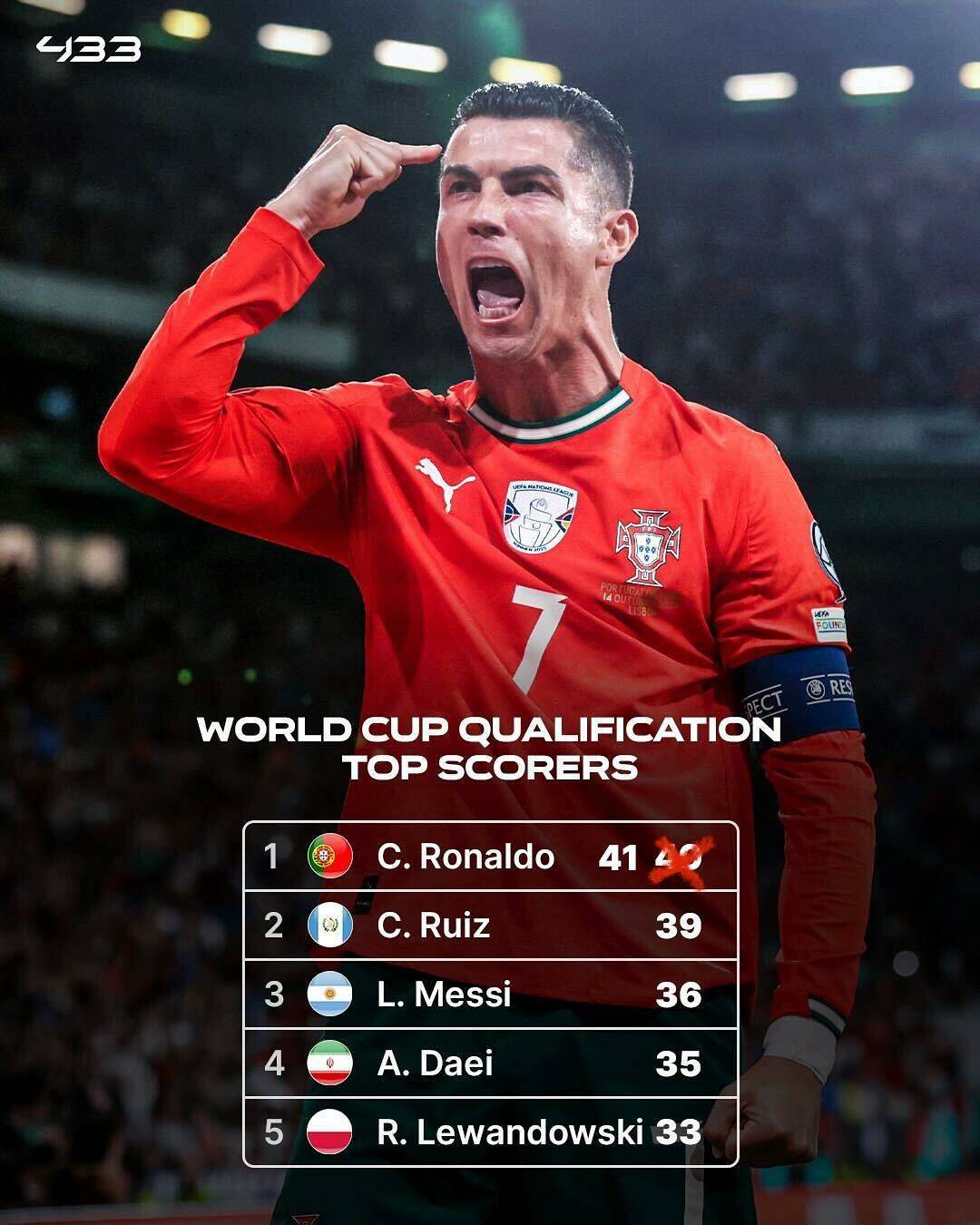 Hai pha lập công này giúp CR7 nâng tổng số bàn thắng tại vòng loại World Cup lên con số 41, phá kỷ lục cũ 39 bàn của Carlos Ruiz (Guatemala) và bỏ xa Lionel Messi (36 bàn).