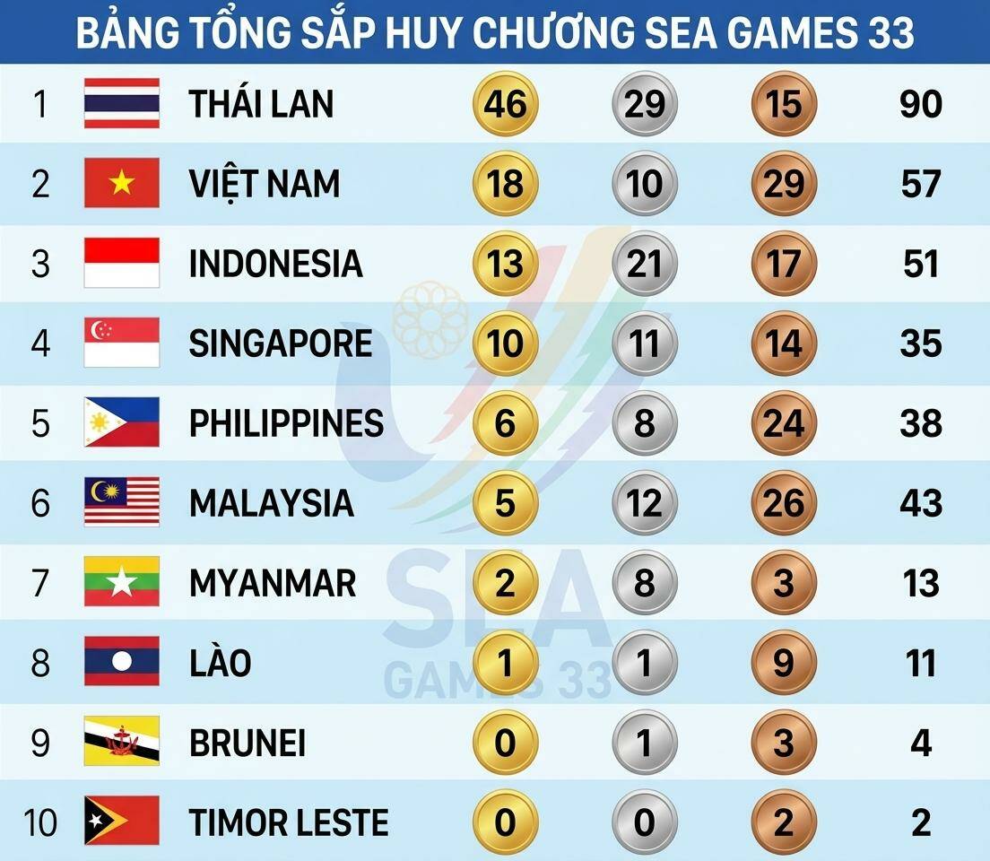 Bảng tổng sắp huy chương SEA Games 33 tính đến 16h chiều 12/12 tiếp tục chứng kiến chủ nhà Thái Lan dẫn đầu với 46 HCV, 29 HCB và 15 HCĐ, nâng tổng số lên 90 huy chương đạt được từ đầu đại hội đến nay. Thái Lan duy trì ưu thế tuyệt đối nhờ ưu thế chủ nhà cùng phong độ ổn định ở nhiều môn trọng điểm và đang tạo khoảng cách khá an toàn với nhóm bám đuổi.