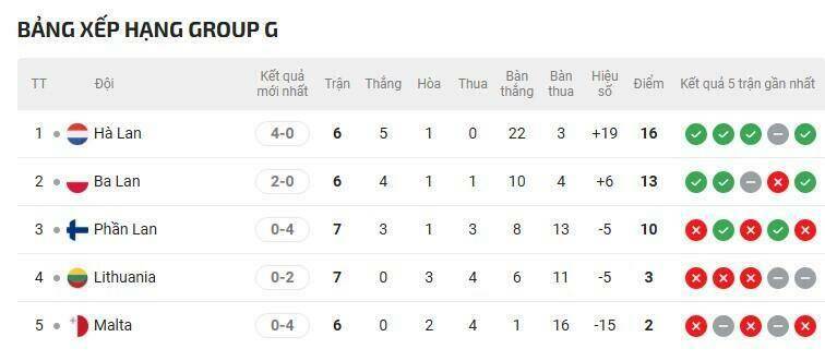 Tại bảng G, Hà Lan tiếp tục khẳng định vị thế ứng viên hàng đầu khi vùi dập Phần Lan 4-0 với thế trận hoàn toàn áp đảo. Các bàn thắng đến đều đặn từ những ngôi sao tấn công của đoàn quân HLV Ronald Koeman giúp đội bóng áo cam duy trì phong độ ấn tượng, củng cố ngôi đầu bảng với 16 điểm sau 6 trận. Trong khi đó, Ba Lan giành chiến thắng 2-0 trên sân Lithuania để giữ vị trí nhì bảng và tiếp tục nuôi hy vọng bám đuổi. Với hiệu số vượt trội và sự ổn định trong lối chơi, Hà Lan gần như nắm chắc tấm vé trực tiếp. Ba Lan sẽ phải toàn thắng các trận còn lại và chờ đợi đối thủ sẩy chân mới có cơ hội lật ngược thế cờ. Phần Lan, Lithuania và Malta gần như đã hết cơ hội, dù vòng loại vẫn còn đến 2 lượt đấu phía trước.