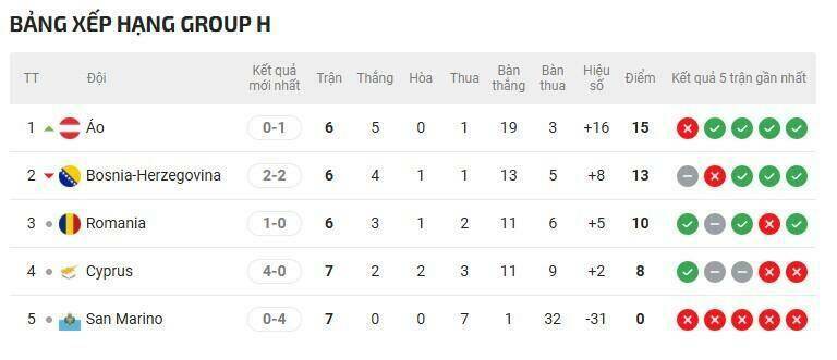 Ở bảng H, bất ngờ lớn đã xảy ra khi Romania đánh bại Áo 1-0 nhờ bàn thắng ở phút bù giờ của trung vệ Virgil Ghita. Chiến thắng này không chỉ chấm dứt chuỗi trận toàn thắng của Áo mà còn khiến cuộc đua giành ngôi đầu trở nên căng thẳng hơn bao giờ hết. Cùng thời điểm, Cyprus dễ dàng hạ San Marino 4-0 để cải thiện vị trí. Còn đội bóng tí hon San Marino tiếp tục chìm sâu ở cuối bảng khi chưa giành nổi điểm nào. Với cục diện hiện tại, Áo và Bosnia vẫn là hai đội nắm lợi thế lớn nhất cho vị trí đầu bảng, nhưng Romania đang trở lại mạnh mẽ và hoàn toàn có thể chen chân vào 2 vị trí dẫn đầu nếu tiếp tục duy trì phong độ hiện tại. Trong khi đó, Cyprus có thể đóng vai trò “ngựa ô” ở giai đoạn cuối, khi liên tục giành điểm trước các đối thủ yếu hơn.