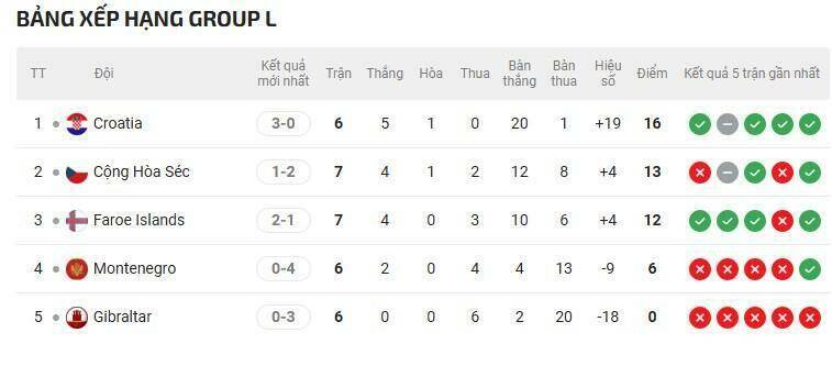 Tâm điểm khác của loạt trận đêm qua nằm ở bảng L, nơi Croatia củng cố sức mạnh bằng chiến thắng 3-0 trước Gibraltar, còn Quần đảo Faroe gây chấn động khi hạ gục CH Czech 2-1. Kết quả này giúp Croatia vững vàng ở ngôi đầu bảng với 16 điểm, duy trì chuỗi bất bại và hiệu số vượt trội. Czech dù vẫn giữ được vị trí nhì bảng nhưng đã bị Quần đảo Faroe thu hẹp khoảng cách đáng kể. Đây là cú sốc lớn bởi Faroe vốn bị đánh giá thấp nhất bảng, song họ đang thể hiện tinh thần chiến đấu và tổ chức lối chơi ấn tượng. Nếu duy trì phong độ này, Quần đảo Faroe hoàn toàn có thể vươn lên tranh vị trí nhì bảng cùng Czech, trong khi Croatia gần như cầm chắc tấm vé trực tiếp đến World Cup 2026. Gibraltar và Montenegro dường như không còn hy vọng khi phong độ kém xa so với nhóm dẫn đầu.