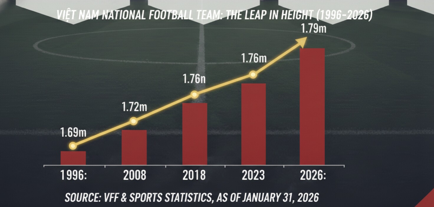 Trong bóng đá hiện đại, bên cạnh kỹ thuật và tư duy chiến thuật, thể hình đã trở thành một "vũ khí" sống còn. Nhìn lại hành trình hơn hai thập kỷ của đội tuyển Việt Nam, chúng ta không chỉ thấy sự thay đổi về lối chơi mà còn chứng kiến một cuộc cách mạng thực sự về mặt thể chất – nơi những con số về chiều cao biết nói lên tham vọng vươn tầm châu lục.