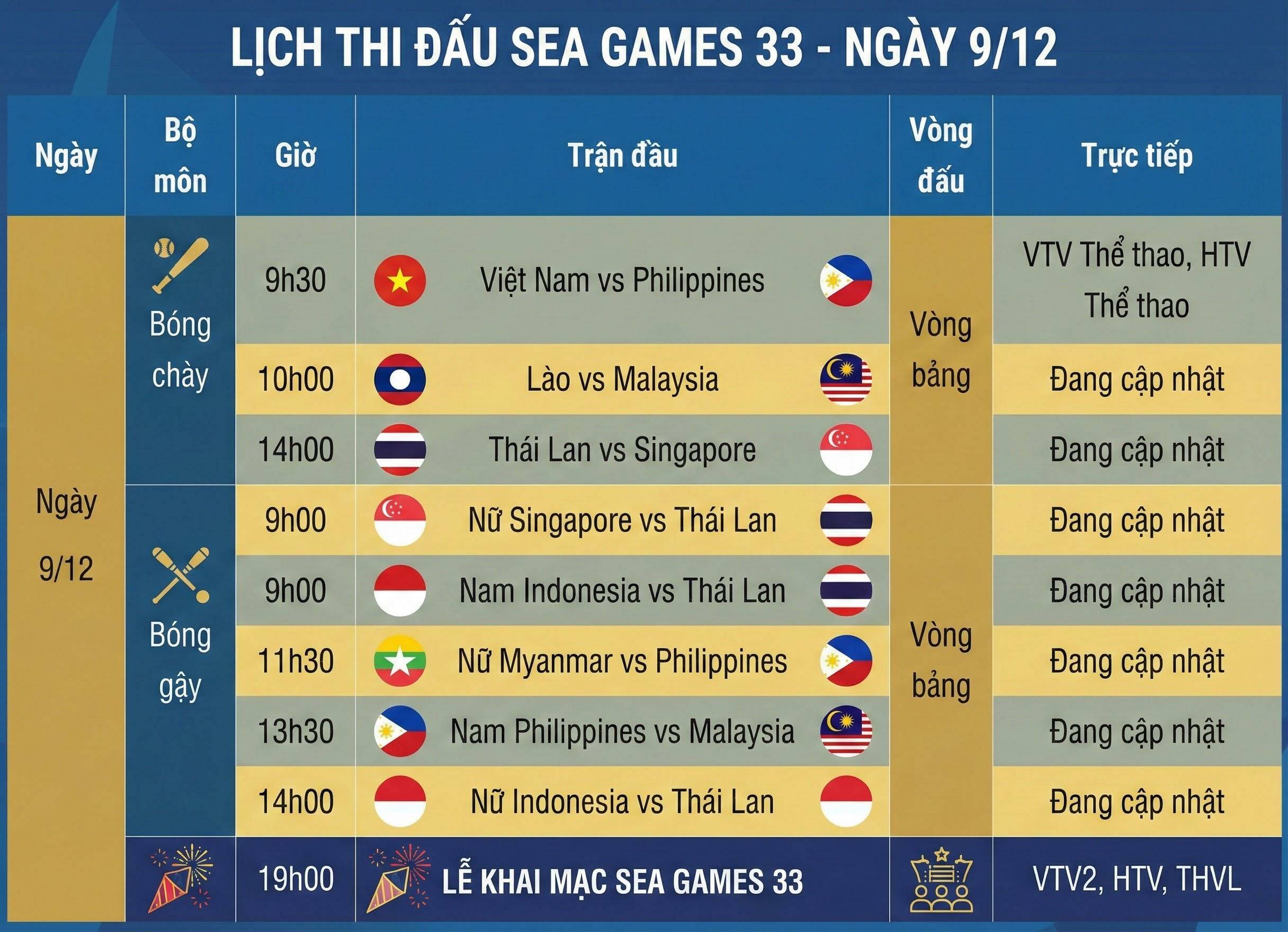 Lịch thi đấu hôm nay của Việt Nam tại Sea Games 33: Bóng chày nam ra trận, chờ đợi Lễ khai mạc hoành tráng