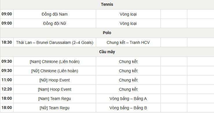 Ở nhóm các môn bóng và đối kháng tập thể, đội tuyển bóng chuyền nữ gặp Myanmar trong trận mở màn, trong khi cầu mây đồng đội nữ cũng thi đấu lượt trận vòng bảng. Quần vợt bước vào vòng loại đơn nữ, đôi nữ và đôi hỗn hợp, còn cầu lông và bóng bàn tiếp tục thi đấu vòng bảng và vòng loại các nội dung đồng đội và cá nhân.