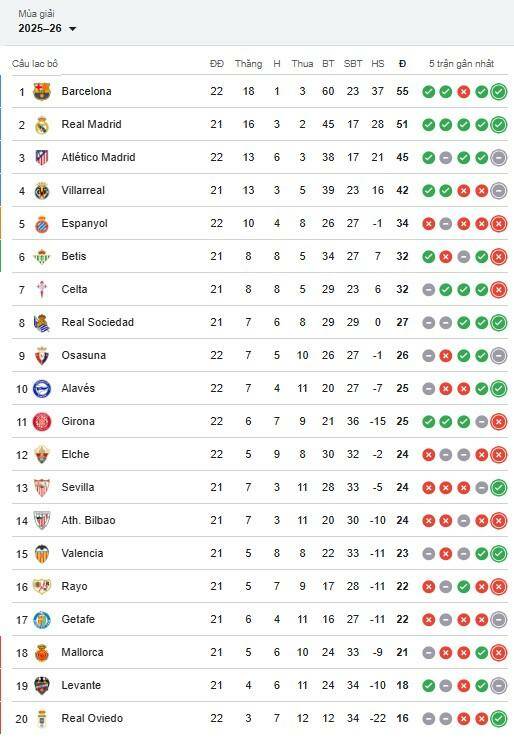 Với 3 điểm trọn vẹn, Barcelona tạm thời nới rộng khoảng cách với Real Madrid lên 4 điểm, gây áp lực lớn lên đối thủ trước trận derby Madrid. Đội bóng xứ Catalunya đang cho thấy sự ổn định và trưởng thành dưới thời Hansi Flick, sẵn sàng bứt phá trong giai đoạn quyết định của mùa giải.