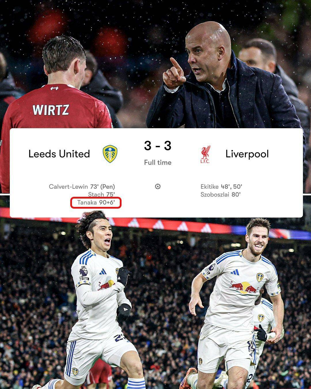 ⏰ 9 phút bù giờ, Leeds dồn lên tổng lực, phút 90+6 Tanaka vô-lê cận thành gỡ hòa 3-3 sau pha bóng chạm tay Gravenberch