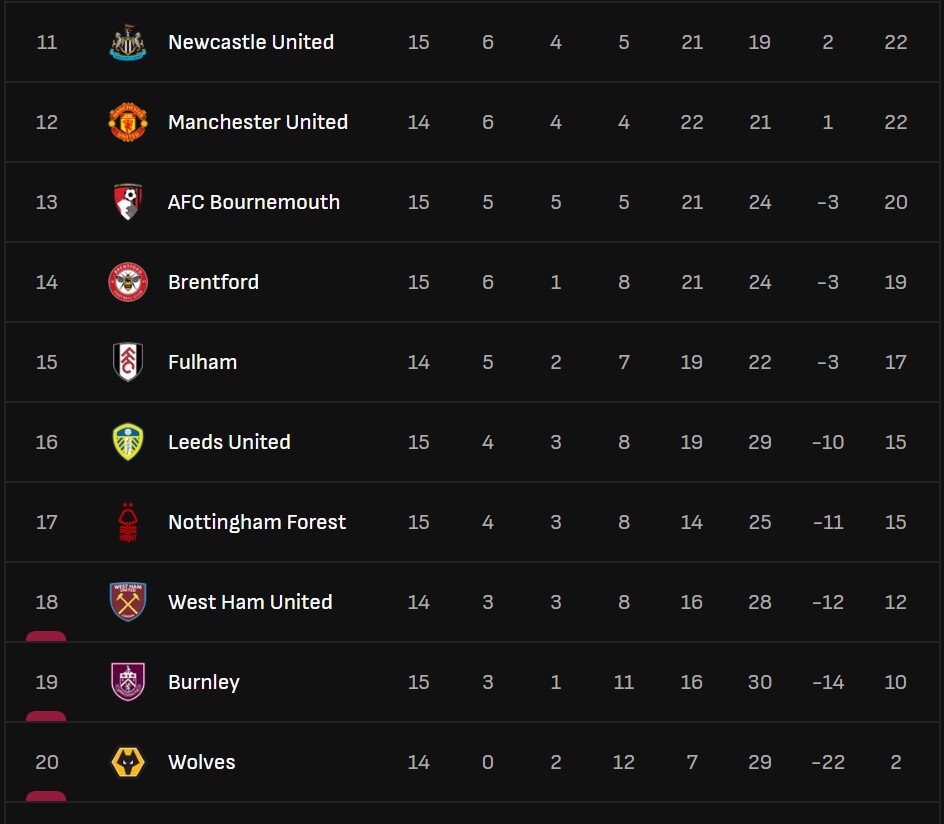 Leeds tiếp tục cho thấy dấu hiệu hồi sinh khi cầm hòa Liverpool để vươn lên 15 điểm, thoát khỏi nhóm nguy hiểm. Nottingham Forest thất bại nặng trước Everton khiến họ rơi xuống vị trí 17, chỉ còn hơn West Ham (12 điểm, chưa đá) đúng 3 điểm. Burnley và Wolves thì vẫn giậm chân trong khủng hoảng.
