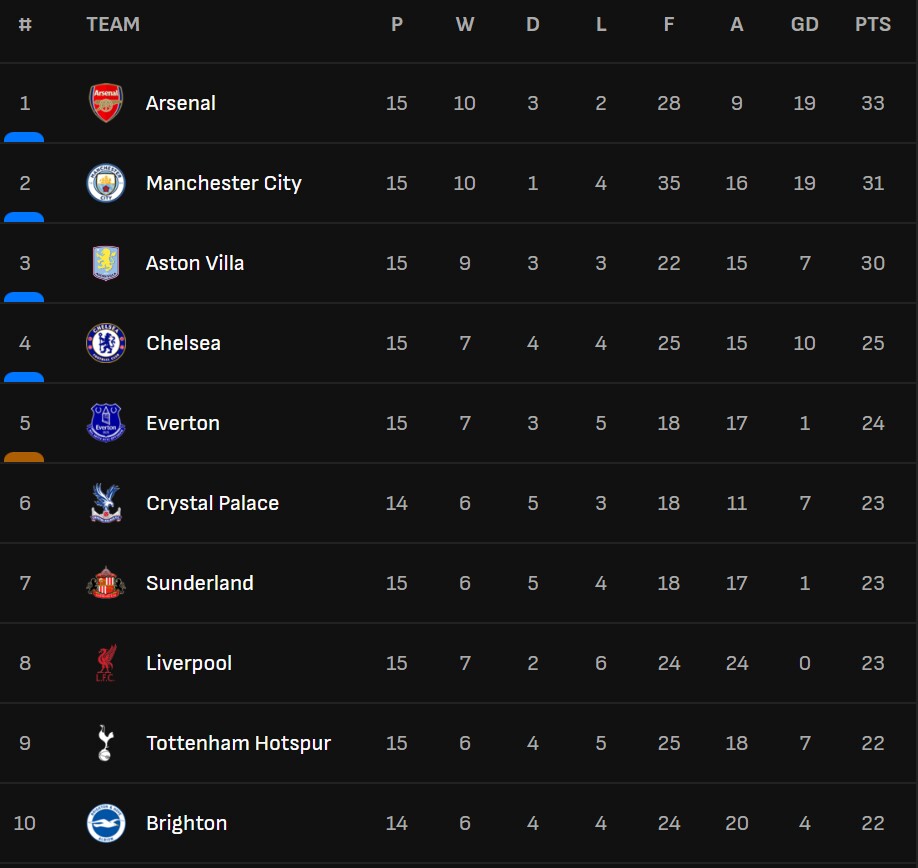 Lượt trận mới nhất vòng 15 không chỉ làm thay đổi cục diện bảng xếp hạng, mà còn mở ra giai đoạn mà từng điểm số đều có giá trị sống còn. Cuộc đua vô địch đã nóng lại, top 4 biến thành mê cung, còn nhóm trụ hạng đang dậy sóng. Premier League chứng minh một lần nữa: đây không chỉ là giải đấu của bóng đá, mà là giải đấu của ý chí và bản lĩnh.