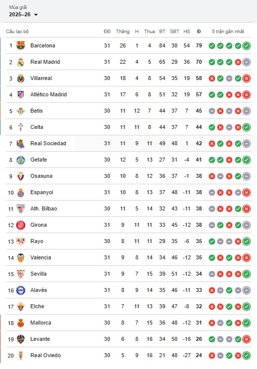 Với 79 điểm sau 31 vòng, Barcelona hơn Real Madrid 9 điểm. Giải chỉ còn 7 vòng, khoảng cách tương đương 3 trận thắng. Để lật ngược thế cờ, Real cần Barca thua ít nhất 4/7 trận còn lại, một kịch bản bị đánh giá là cực khó khi lần gần nhất thầy trò Hansi Flick ngã ngựa ở La Liga đã cách đây 2 tháng.