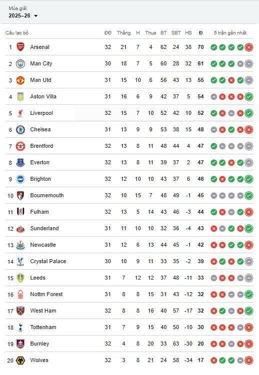 Ở chiều ngược lại, Bournemouth rời Emirates với 3 điểm quý như vàng. Chiến thắng giúp họ vươn lên vị trí thứ 10 với 45 điểm sau 32 trận, chỉ còn kém đội hạng 7 Brentford đúng 2 điểm. Từ chỗ phải lo trụ hạng, Bournemouth bất ngờ mở ra hy vọng chen chân vào nhóm dự cúp châu Âu, khiến cuộc đua nửa trên bảng xếp hạng thêm phần sôi động.
