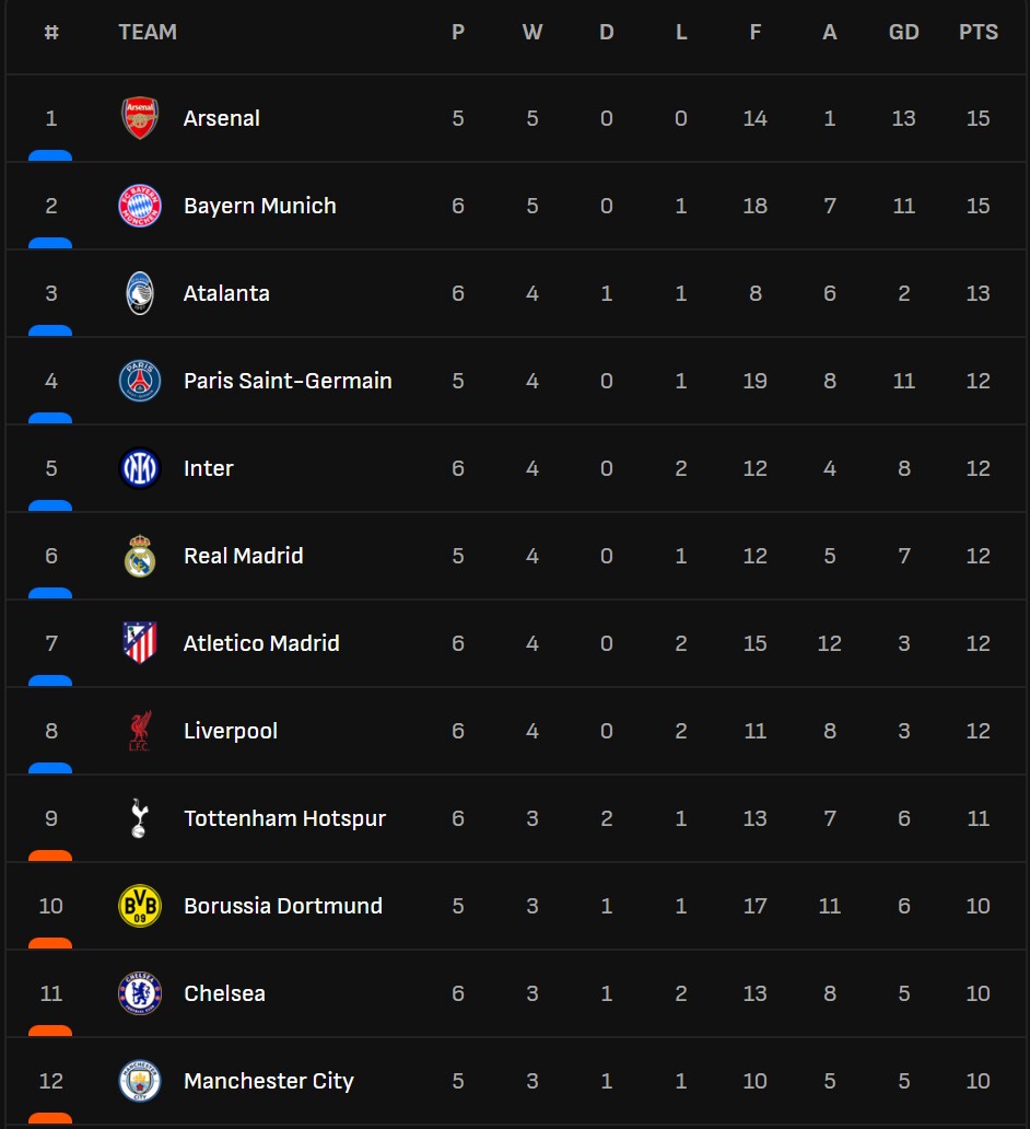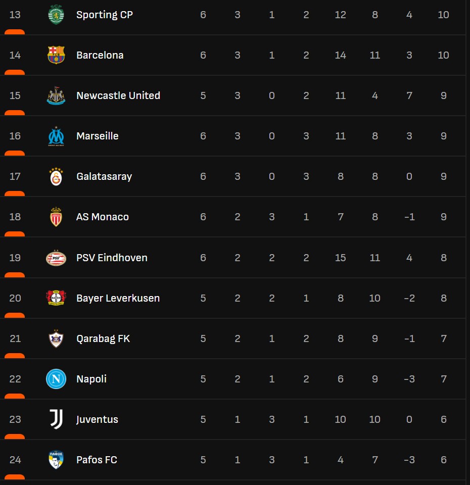 Cuộc chiến từ vị trí 9 đến 24 đang căng như dây đàn. Barcelona leo lên hạng 14 sau chiến thắng quan trọng trước Frankfurt, nhưng họ vẫn chưa đủ gần để đe dọa top 8 và cần sự ổn định hơn nữa nếu muốn bứt phá. Chelsea là gương mặt gây thất vọng lớn nhất đêm qua: thất bại trước Atalanta khiến họ rơi xuống hạng 10, một lời cảnh báo mạnh mẽ rằng những vấn đề chiến thuật không thể che giấu lâu hơn được nữa. Marseille và Monaco tiếp tục duy trì sức ép với những chiến thắng rất quan trọng. Tottenham cũng đang bám sát top 8 sau trận thắng 3-0, cho thấy họ đã dần trở lại quỹ đạo dù đầu mùa gặp rất nhiều biến động.