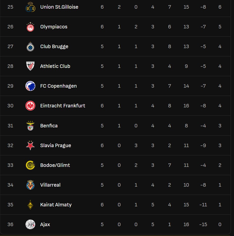 Ở phần cuối bảng xếp hạng, vòng đấu này cho thấy sự phân lớp rõ rệt. Olympiakos dù thắng nhưng vẫn đứng trước nguy cơ tụt lại khi khoảng cách điểm quá mong manh. Eintracht Frankfurt, sau thất bại trước Barcelona, rơi vào vùng nguy hiểm và thiếu đi sự sắc bén trong cả tấn công lẫn phòng ngự. Union Saint-Gilloise cũng không khá khẩm hơn khi thất thủ trước Marseille. Ajax, Villarreal hay Kairat vẫn giậm chân trong nhóm cuối, chưa tìm được lối ra. Khi giai đoạn phân loại đã đi qua hơn nửa chặng đường, dấu hiệu “bị bỏ lại” ngày càng rõ ràng.