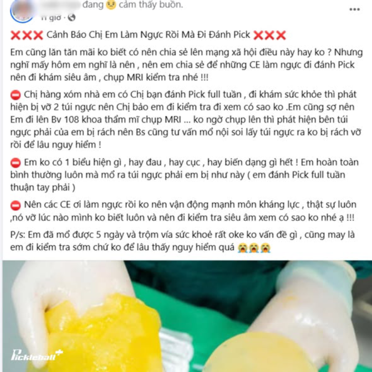 Pickleball thường được xem là môn thể thao nhẹ nhàng hơn tennis, song thực tế lại đòi hỏi người chơi phải xoay người liên tục, vung vợt mạnh, chạy nước rút và tiếp cận bóng nhanh. Đối với những người chơi thường xuyên, cường độ vận động tích lũy theo thời gian là không nhỏ. Chị L.C chia sẻ, do thuận tay phải và chơi nhiều, vùng ngực phải của chị chịu lực xoắn và chấn động nhiều hơn, có thể là nguyên nhân khiến túi độn bên này bị tổn thương trước mà không hề hay biết.