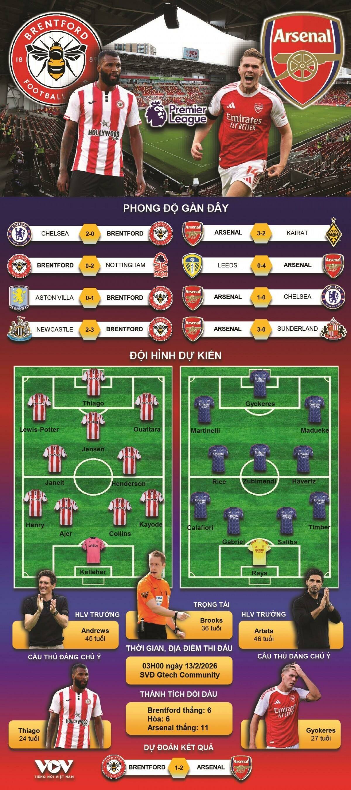 Trận đấu giữa Brentford và Arsenal tại vòng 26 Ngoại hạng Anh 2025/2026 hứa hẹn sẽ mang đến nhiều kịch tính. Brentford, với lợi thế sân nhà, luôn là đối thủ khó chịu với bất kỳ đội bóng lớn nào. Tuy nhiên, Arsenal đang có phong độ ổn định và quyết tâm bám đuổi nhóm đầu bảng, khiến cuộc đối đầu này càng trở nên hấp dẫn.
