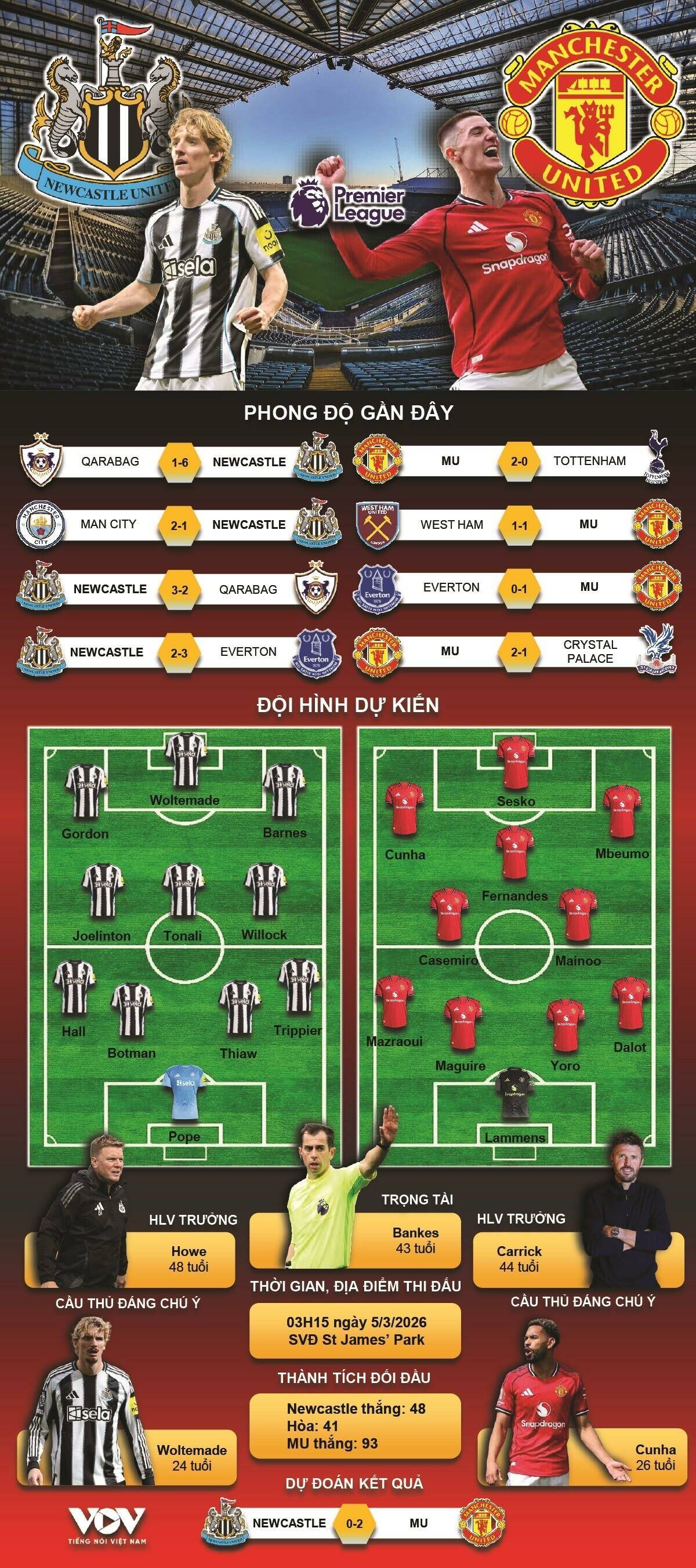 Newcastle bước vào trận đấu với MU trong bối cảnh đội hình sứt mẻ nghiêm trọng do chấn thương. Điều này khiến họ gặp nhiều khó khăn trong việc duy trì sự ổn định về lối chơi cũng như kết quả thi đấu. Ngược lại, MU đang có phong độ tốt, các trụ cột đều đạt thể trạng cao và tinh thần toàn đội lên cao sau những chiến thắng quan trọng gần đây.