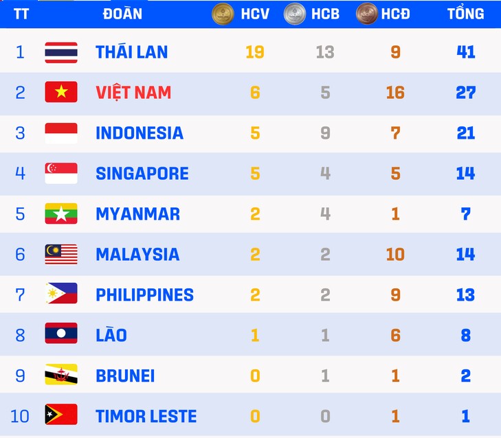 Ở nhóm cuối bảng, Lào, Brunei và Timor Leste đã có những huy chương đầu tiên nhưng chưa đủ để thay đổi cục diện chung. Nhìn tổng thể, chiều và tối nay hứa hẹn tiếp tục là thời điểm để Việt Nam chúng ta có cơ hội gia tăng thành tích, đặc biệt ở các môn thế mạnh chuẩn bị thi đấu các nội dung chung kết như bơi, điền kinh hay thể dục dụng cụ.