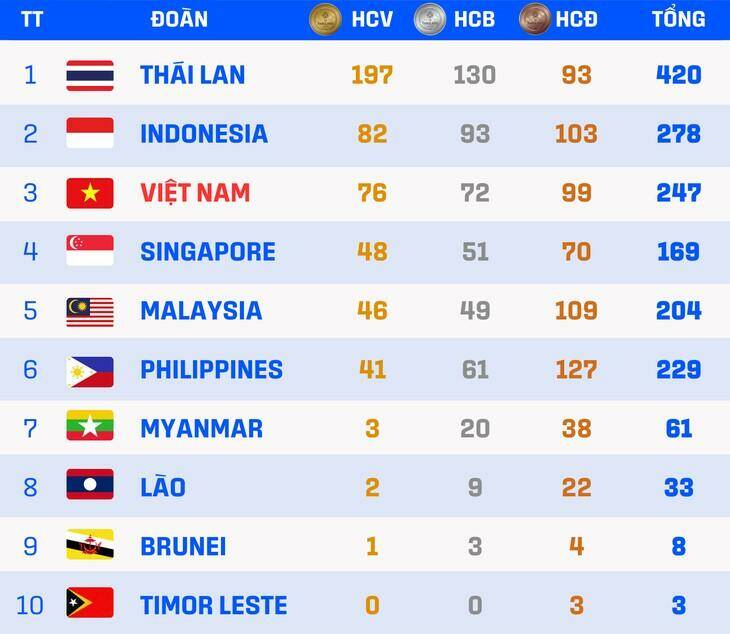 Bảng tổng sắp huy chương SEA Games 33 cập nhật đến 13h chiều ngày 19/12Thái Lan tiếp tục dẫn đầu tuyệt đối với 197 HCV, 130 HCB và 93 HCĐ, qua đó nâng tổng số huy chương đạt được ở kỳ đại hội này lên 420. Chủ nhà vẫn duy trì ưu thế vượt trội ở nhiều môn thi đấu, tạo khoảng cách rất lớn so với các đoàn bám đuổi phía sau.