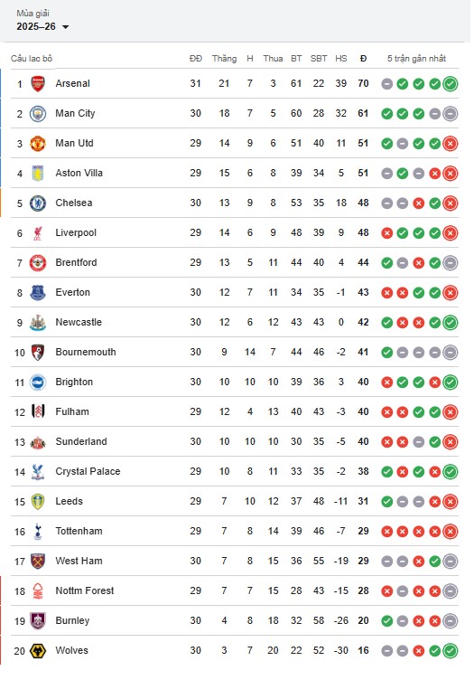 Arsenal tiếp tục thể hiện bản lĩnh của ứng viên vô địch khi vượt qua Everton trong một trận đấu đầy khó khăn. Suốt phần lớn thời gian, hàng thủ Everton chơi kín kẽ khiến các chân sút của "Pháo thủ" gần như bất lực. Tuy nhiên, những điều chỉnh chiến thuật của HLV Arteta đã phát huy tác dụng ở thời điểm quyết định. Sự tỏa sáng của Gyokeres và tài năng trẻ Dowman trong những phút cuối giúp Arsenal giành chiến thắng 2-0, qua đó giữ vững ngôi đầu với 70 điểm.