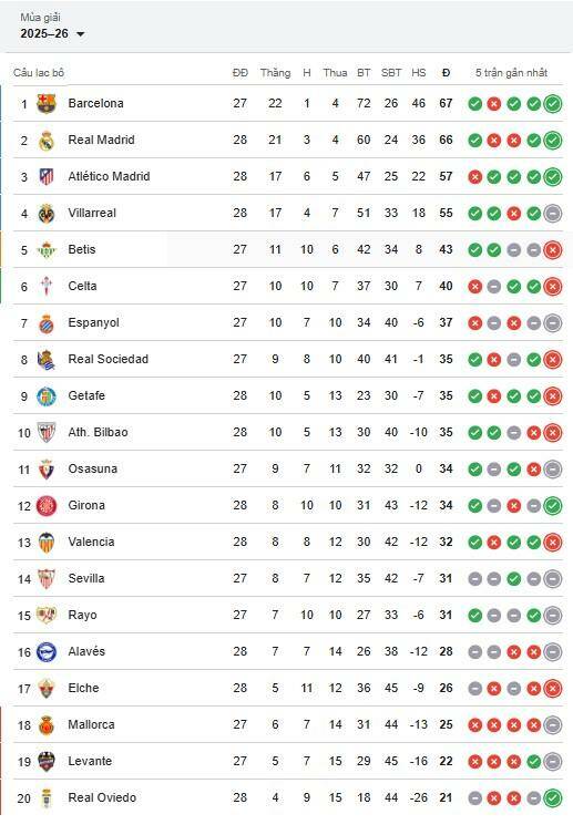 Sau các trận đấu diễn ra rạng sáng nay, cục diện ở nhóm đầu của La Liga vẫn cực kỳ căng thẳng. Barcelona tạm thời đứng đầu bảng với 67 điểm sau 28 vòng đấu nhưng chơi ít hơn 1 trận, trong khi Real Madrid bám sát ngay phía sau với 66 điểm. Khoảng cách chỉ một điểm khiến cuộc đua vô địch mùa này trở nên cực kỳ hấp dẫn khi cả hai đội đều duy trì phong độ ổn định trong giai đoạn then chốt. Đứng ở vị trí thứ ba là Atlético Madrid với 57 điểm, vẫn còn cơ hội gây áp lực lên hai đội dẫn đầu nếu duy trì được chuỗi chiến thắng trong những vòng đấu tới. Phía sau nhóm này là các đội như Villarreal và Betis đang cạnh tranh quyết liệt cho các suất dự cúp châu Âu. Khi mùa giải chỉ còn khoảng mười vòng đấu nữa là khép lại, từng trận thắng lúc này đều có ý nghĩa như một bước ngoặt quyết định trong cuộc đua danh hiệu. Với phong độ hiện tại, cuộc chiến giữa Barcelona và Real Madrid hứa hẹn sẽ còn kéo dài tới những vòng cuối cùng của mùa giải, trong khi Atletico Madrid vẫn âm thầm chờ đợi cơ hội bứt lên nếu hai đối thủ phía trên sảy chân.