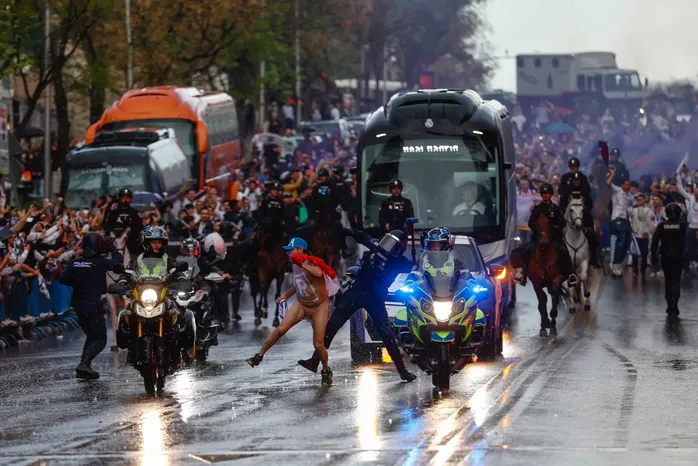 Đám đông người hâm mộ vẫn xếp hàng dọc các con phố, hát vang và tiếp tục tiếp lửa cho Real Madrid. Tuy nhiên, khoảnh khắc người đàn ông khỏa thân lao ra trước đầu xe buýt cùng phản ứng quyết liệt của cảnh sát đã trở thành điểm nhấn khó quên trong ngày đội bóng Hoàng gia Tây Ban Nha bước vào trận tứ kết lượt đi Champions League với Bayern Munich.