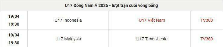 U17 Indonesia vs U17 Việt Nam (19h30 ngày 19/04, lượt trận cuối vòng bảng U17 Đông Nam Á 2026)