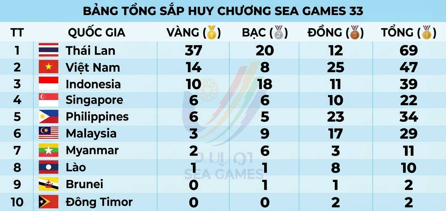 Tính đến 20h tối 11/12, cục diện bảng tổng sắp SEA Games 33 tiếp tục cho thấy sức mạnh áp đảo của Thái Lan, khi đoàn chủ nhà đã nâng thành tích lên 37 HCV, 20 HCB và 12 HCĐ, vững vàng ở ngôi đầu với tổng cộng 69 huy chương. Khoảng cách họ tạo ra với phần còn lại ngày càng lớn, phản ánh phong độ vượt trội ở các môn sở trường từ đua thuyền, võ thuật đến những nội dung kỹ thuật cao.