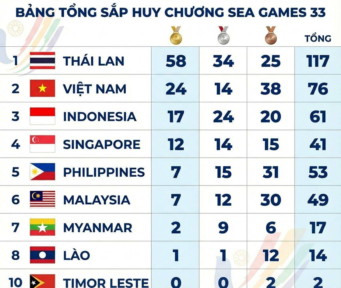 Bảng tổng sắp huy chương SEA Games 33 tính đến 16h40 chiều ngày 12/12 cho thấy Thái Lan tiếp tục dẫn đầu tuyệt đối với 53 HCV, 31 HCB và 17 HCĐ, tổng cộng 101 huy chương từ đầu kỳ đại hội đến hiện tại. Chủ nhà đang thể hiện sức mạnh trải rộng trên nhiều môn thi đấu, đặc biệt ở các môn nền tảng, qua đó tạo khoảng cách khá lớn với nhóm phía sau và duy trì ưu thế vững chắc trong cuộc đua toàn đoàn.