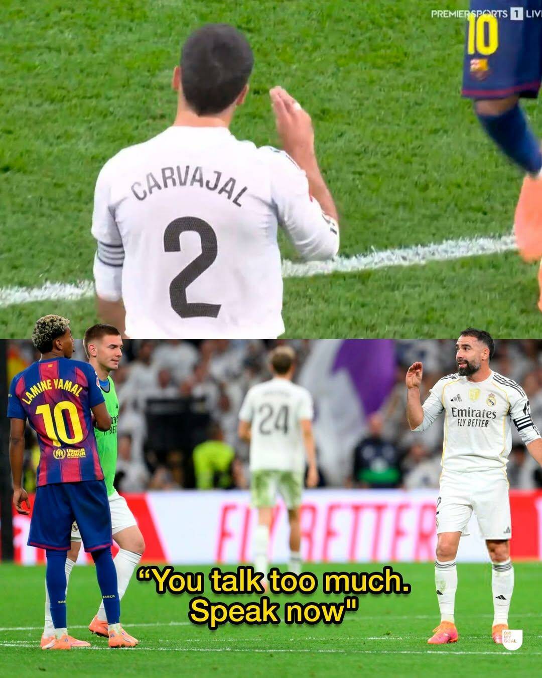 Ngay khi trọng tài thổi còi mãn cuộc, Dani Carvajal tiến đến đối mặt với Yamal và liên tục nói: “Mày nói nhiều quá đấy”, kèm theo cử chỉ rõ ràng bằng tay.