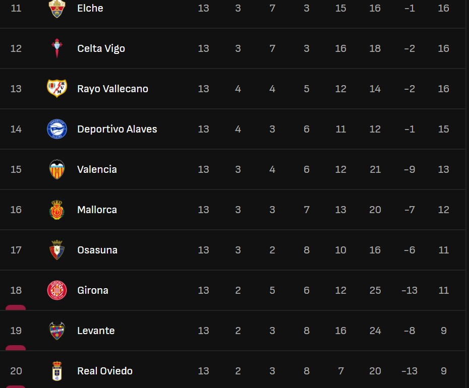 Levante và Real Oviedo tiếp tục dậm chân tại chỗ với 9 điểm, và ngày càng bị bóp nghẹt bởi lịch thi đấu khó khăn. Những Valencia (13 điểm), Mallorca (12 điểm) và Osasuna (11 điểm) cũng đang bị kéo vào vòng xoáy, đặc biệt khi phong độ của họ không hề cho thấy dấu hiệu ổn định.