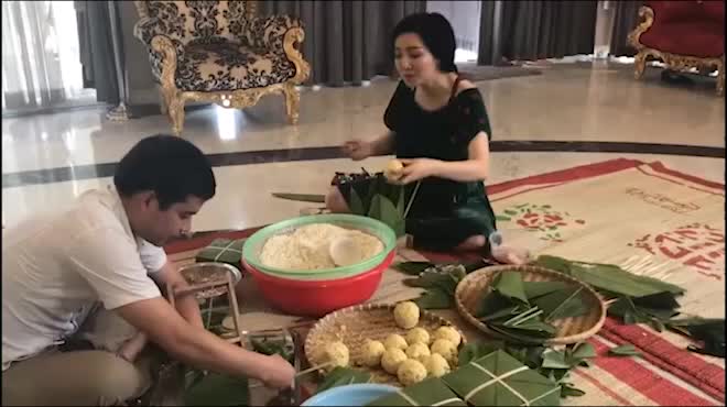 Hoa hậu Giáng My trổ tài gói bánh chưng ngày cận Tết Nguyên đán.