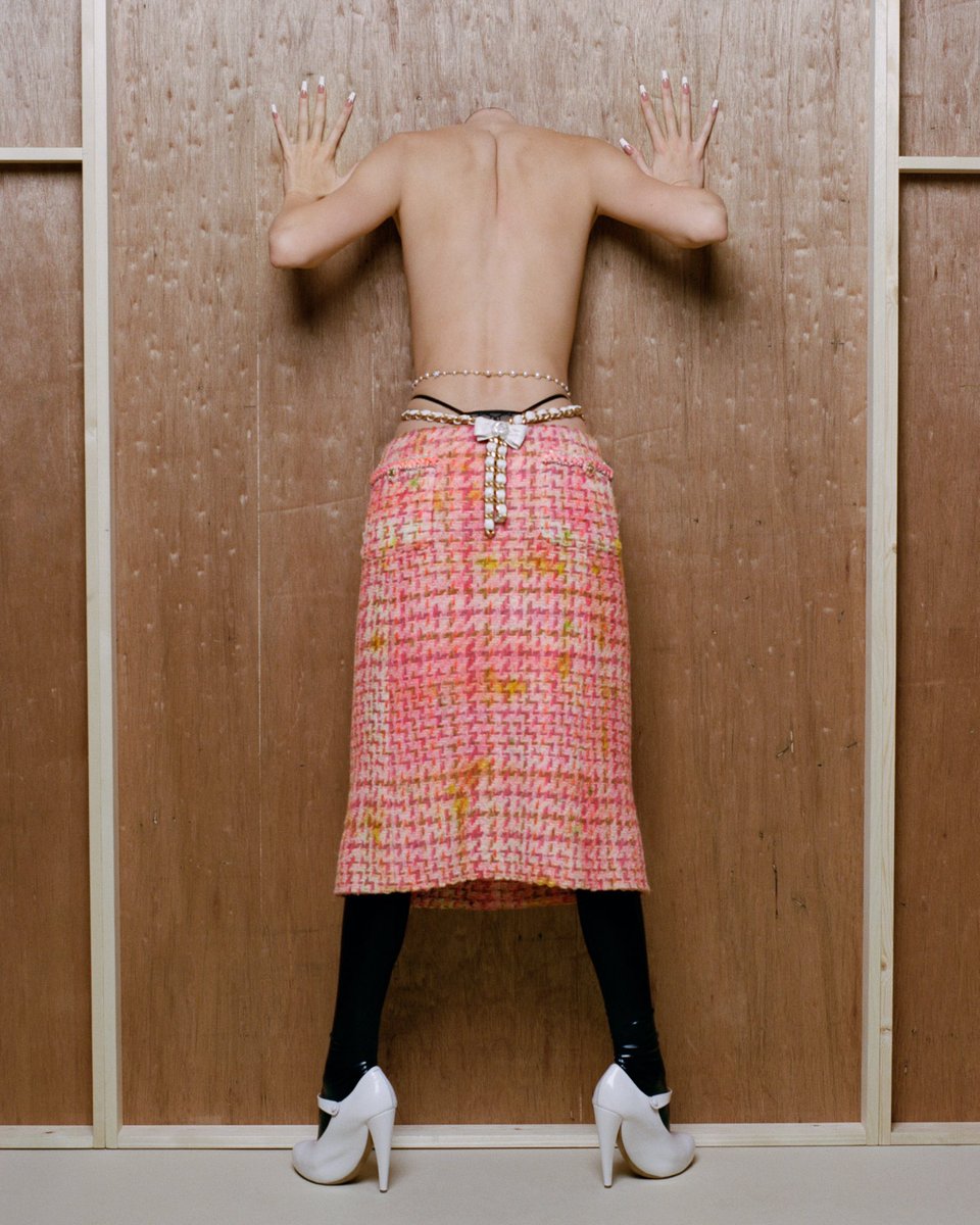 Kendall Jenner được xem là người nối kết giữa thời trang và nghệ thuật đương đại. Bởi vậy tấm hình bán nude của cô không bị chê bai là phản cảm. Trong tấm hình này, cô mặc chiếc váy dạ tweed của Chanel theo kiểu khoe nội y ấn tượng. Kết hợp với trang phục là đôi giày cao gót của thương hiệu Maison Margiela.