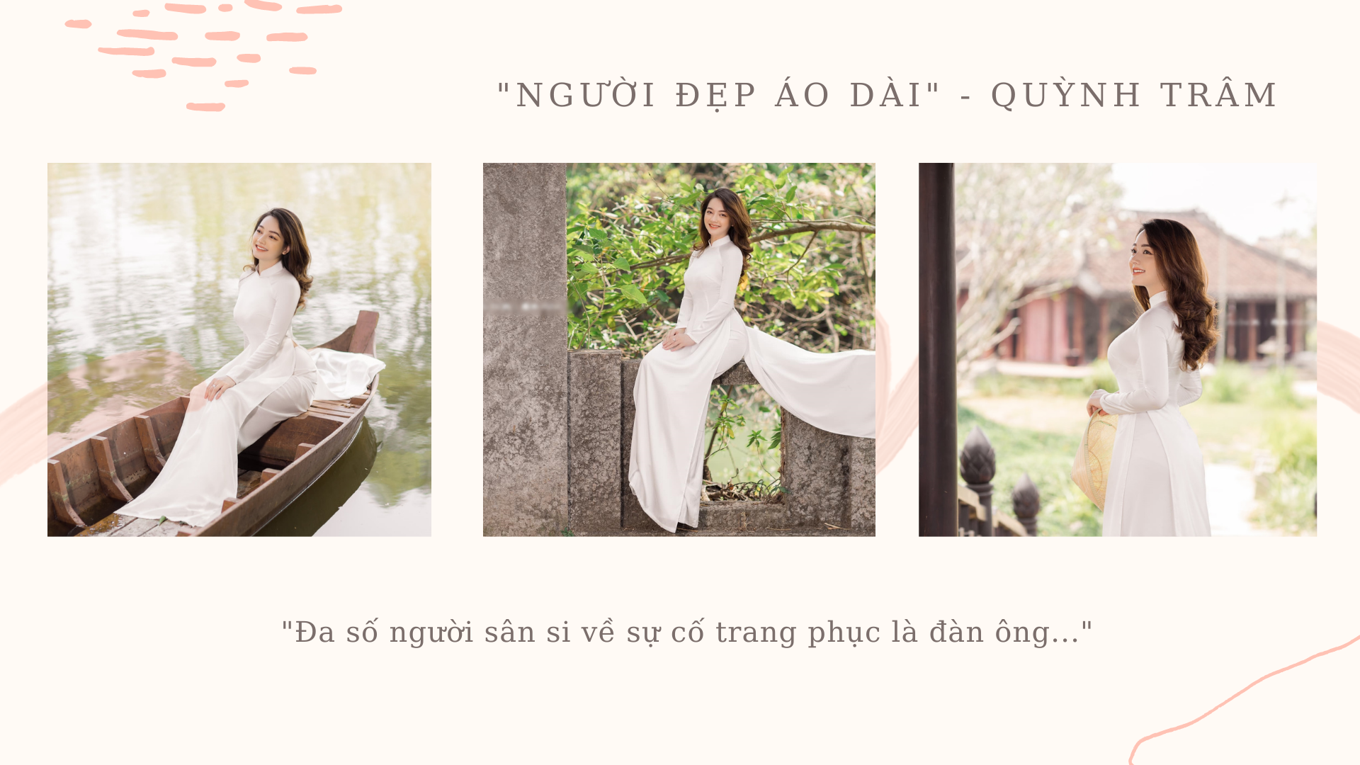 - Nhắc đến sự cố tôi cũng muốn kể lại chuyện này. Mỗi lần đi chụp hình áo dài tôi luôn mặc quần trong màu trắng để tránh trường hợp phản cảm. Chỉ duy nhất một lần bị lộ quần trong bằng chất liệu ren. Tôi muốn thanh minh là bình thường chỉ cần mặc đồ màu trắng là các anh photo về xử lý hình ảnh. Trước đây, tôi cũng mặc như vậy nhưng chưa bị lộ lần nào và chưa từng bị ai chê trách. Nhưng lần đó có anh photo quên xử lý nên bị lộ viền của quần trong.