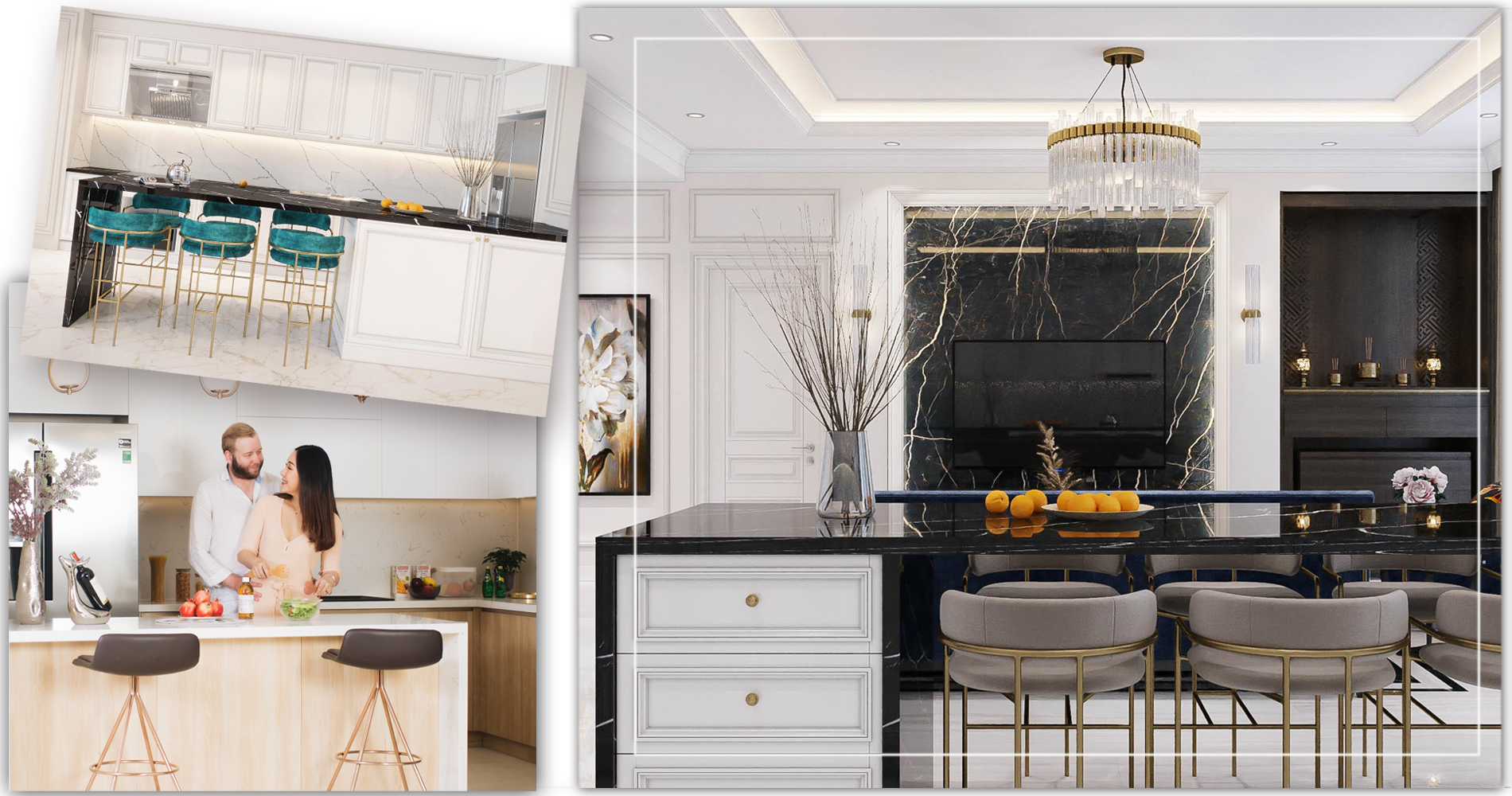 Với chủ nhân có gout, thì phòng bếp đơn điệu là không gian đầu tiên cần được thay đổi. Một quầy bar được đặt cạnh bếp tạo điểm nhấn cho không gian căn hộ thêm phần sang trọng, tiện nghi. Tại đây, các thành viên trong gia đình sẽ trải qua những phút giây thoải mái, vui vẻ và ấm cúng bên nhau.