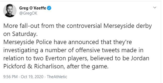 Cũng theo nguồn tin từ tờ Athletic, cảnh sát vùng Merseyside đang bắt đầu mở cuộc điều tra về một số lời lẽ quá khích trên mạng xã hội nhắm vào hai cầu thủ Everton sau khi trận đấu với Liverpool kết thúc. Danh tính của hai cầu thủ này không được tiết lộ nhưng tờ Athletic cho rằng cầu thủ đầu tiên là Jordan Pickford còn người kia là Richarlison.