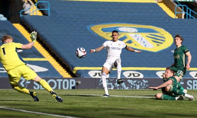 Raphinha chuyền vượt tuyến nhắm đến vị trí của trung phong Rodrigo Moreno, người vừa vào sân thay Patrick Bamford nhưng bóng đi quá sâu.