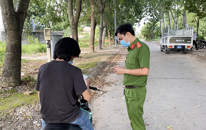 Công an kiểm tra giấy tờ người dân tại bờ sông công viên khu dân cư Bắc Rạch Chiếc.