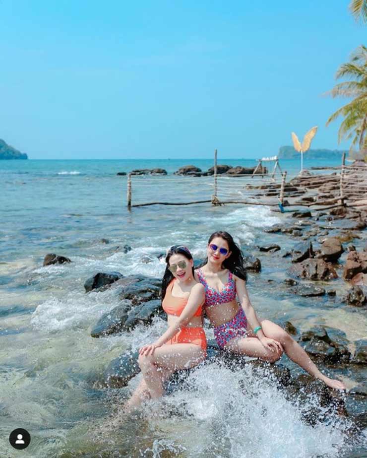 Trên trang Instagram của mình, cây chuyền hai của CLB Ngân hàng Công Thương khoe ảnh diện bikini với họa tiết chấm bi nổi bật (phải) khi tạo dáng cùng người bạn thân xinh đẹp là cựu kiện tướng Dancesport quốc gia kiêm MC truyền hình Phan Nguyễn Quỳnh Hương