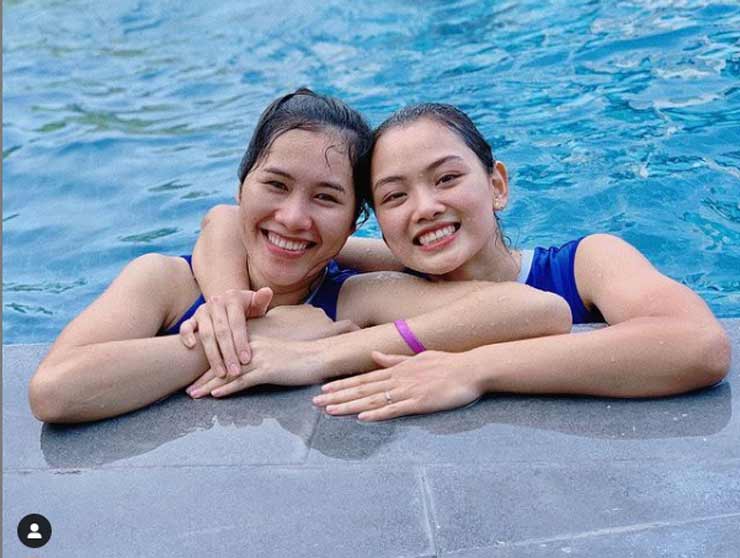 Thu Hoài (phải) vui vẻ ghi lại khoảnh khắc thư giãn trong bể bơi cùng người đồng đội Nguyễn Thị Trinh khi họ cùng đội tuyển bóng chuyền nữ Việt Nam đến Philippines dự SEA Games 30 cách đây 2 năm