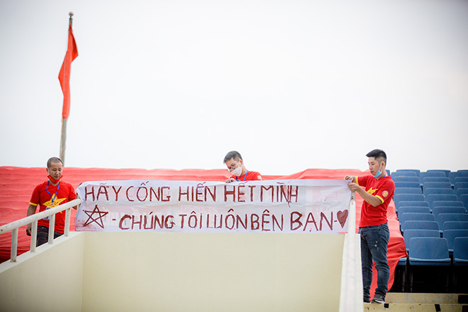 Anh Phan Đình Long, chủ tịch Hội CĐV VFS Miền Bắc chia sẻ: ''Thực hiện công việc này trong lúc dịch bệnh đang diễn biến phức tạp, nên cũng rất khó khăn, ngoài việc xin giấy xác nhận đi lại, mua đồ để làm banner, rồi xin cấp phép để được vào sân, anh em hội CĐV còn phải test RT- PCR âm tính mới thực hiện được. Cũng may mắn là VFF hỗ trợ hết sức, nên cuối cùng công việc cũng trọn vẹn''.