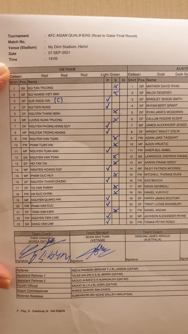 Danh sách đội hình xuất phát của ĐT Việt Nam