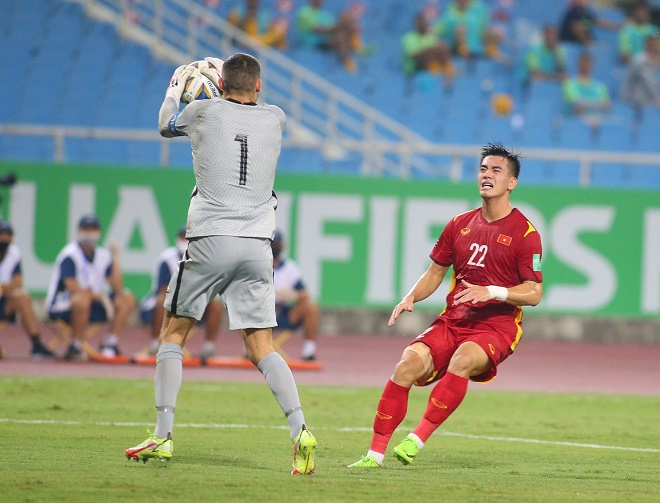 Trọng Hoàng chuyền dài cho Tiến Linh thoát xuống nhưng thủ môn Ryan đã băng ra khỏi vòng cấm phá bóng kịp thời.