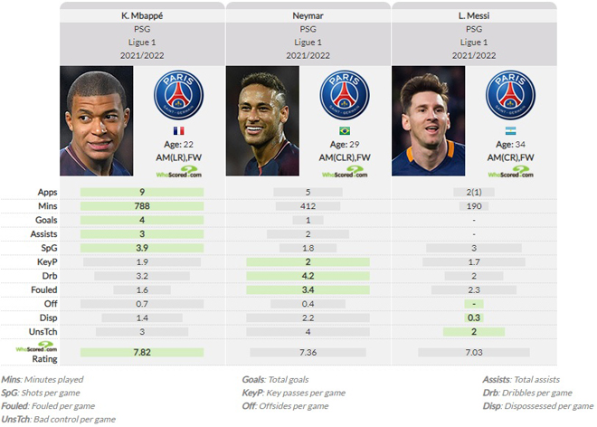 Cầu thủ người Pháp chỉ có 1 bàn và 3 kiến tạo kể từ Messi gia nhập trong khi con số này của tiền đạo người Brazil là 1 bàn và 2 kiến tạo. Những con số này quả thật là quá ít ỏi so với kỳ vọng của các cổ động viên. Không nhiều người nghĩ rằng Ligue 1 lại khó đến vậy cho 3 ngôi sao hay nhất bóng đá đương đại đặc biệt là Messi.