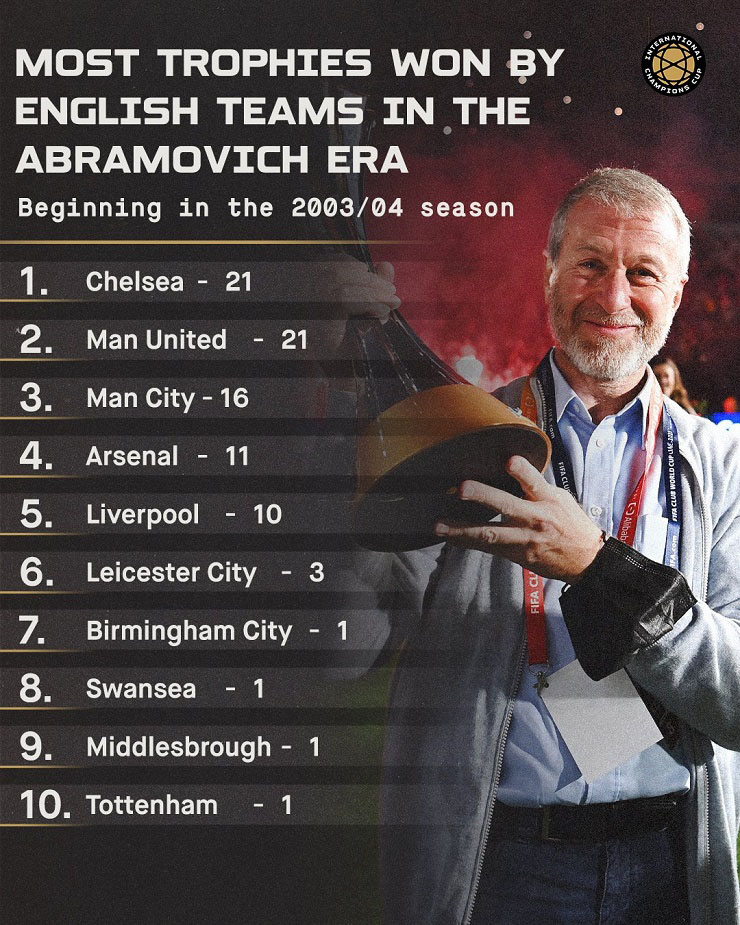 Dưới thời Abramovich, Chelsea đã 5 lần vô địch Premier League, 2 Champions League, 2 Europa League và nhiều danh hiệu khác. Drogba, Lampard, Terry, Petr Cech, Hazard, Kante… là những gương mặt nổi bật đóng góp cho sự thành công của Chelsea trong 19 năm qua.